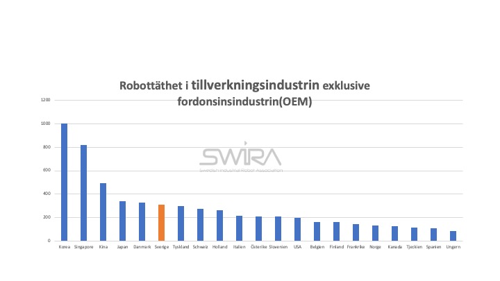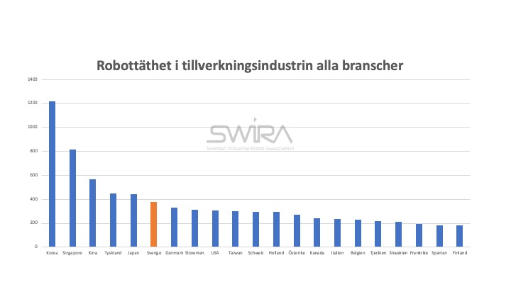 Ny rapport från International Federation of Robotics (IFR) visar att Sverige halkar efter när det gäller robottäthet i tillverkningsindustrin. Robottätheten beskriver hur många industrirobotar som är i drift per 10 000 anställda i tillverkningsindustrin. Eftersom måttet relateras till antalet anställda blir det möjligt att jämföra länder, branscher och tidsperioder – oavsett industrins storlek. En hög robottäthet signalerar avancerad automation, hög produktivitet och stark internationell konkurrenskraft.